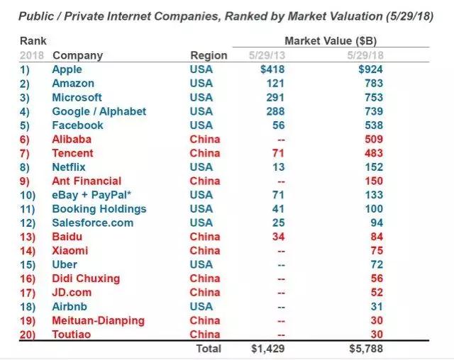 “互聯(lián)網女皇” Mary Meeker在2018年的報告中指出,全球20個市值或估值最大的互聯(lián)網公司中,以阿里巴巴為首的中國企業(yè)就占據了9家,美國有11家。