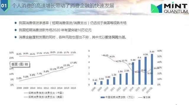 美國(guó)是個(gè)人消費(fèi)實(shí)力很強(qiáng)的一個(gè)國(guó)家,我們以它為標(biāo)桿。圖中藍(lán)線代表中國(guó),紅線代表美國(guó)。預(yù)測(cè)中國(guó)短期個(gè)人貸款到2020年達(dá)10萬(wàn)億元,可見(jiàn)市場(chǎng)龐大。個(gè)人消費(fèi)不僅僅靠大銀行,還要靠其他小型機(jī)構(gòu);因?yàn)榇筱y行本身這種特點(diǎn)(客群優(yōu)質(zhì)),很難下放到下層服務(wù)。在信用風(fēng)險(xiǎn)中欺詐風(fēng)險(xiǎn)在我國(guó)占的比例非常高,數(shù)額也比較大,經(jīng)常是有組織的欺詐,如做“網(wǎng)絡(luò)黑產(chǎn)”有百萬(wàn)級(jí)人員,市場(chǎng)規(guī)模為千億級(jí),很多公司被迫無(wú)法經(jīng)營(yíng),據(jù)估計(jì),互聯(lián)網(wǎng)金融一半以上的壞賬風(fēng)險(xiǎn)來(lái)自欺詐風(fēng)險(xiǎn)。對(duì)比美國(guó)這方面比例就相對(duì)小的很多,如一個(gè)千億級(jí)個(gè)人消費(fèi),中能達(dá)20-30億美元,美國(guó)則只有幾千萬(wàn)美元。原因有一點(diǎn)是美國(guó)征信做的比較好,幾乎覆蓋所有成年人。反欺詐就是提高欺詐的成本。