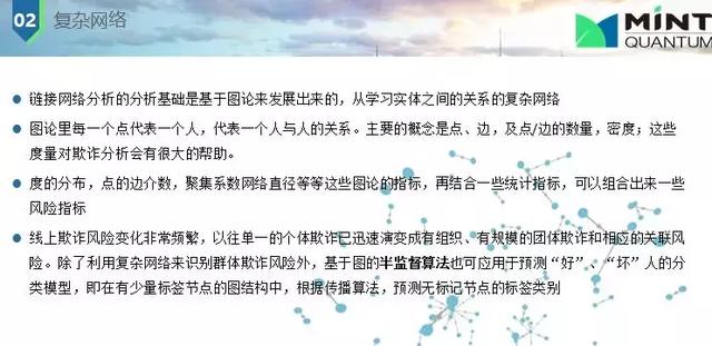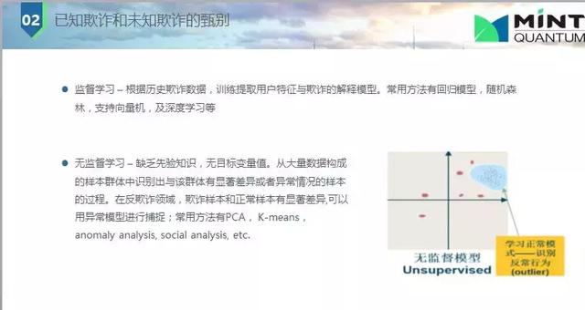 下面是欺詐與未知欺詐甄別問(wèn)題,主要是監(jiān)督學(xué)習(xí)和非監(jiān)督學(xué)習(xí)。監(jiān)督學(xué)習(xí)是知道一個(gè)人以前欺詐(父母信息不對(duì),電話號(hào)碼有誤等),我們就會(huì)打上標(biāo)簽,歷史數(shù)據(jù)就會(huì)訓(xùn)練我們的模型,統(tǒng)計(jì)模型所用數(shù)據(jù)大都都是有標(biāo)簽的;非監(jiān)督學(xué)習(xí)也是經(jīng)常使用的,因?yàn)槠墼p是經(jīng)常改變的或不同特征的,我并不知道他是否是欺詐,我們用關(guān)聯(lián)網(wǎng)絡(luò),每個(gè)人間有聯(lián)系,這種網(wǎng)絡(luò)快速發(fā)展;還有一種是兩者結(jié)合起來(lái),利用權(quán)重評(píng)估。