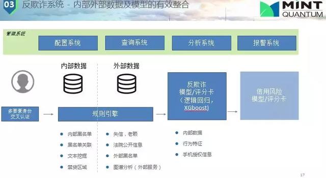 接下來(lái)講一下我們線上的一個(gè)反欺詐系統(tǒng)框架,下圖簡(jiǎn)化了實(shí)際反欺詐系統(tǒng)。介紹了基本流程,首先是身份的交叉驗(yàn)證,證明你是你。不光是銀行卡、手機(jī)、身份證交叉認(rèn)證,還有你的照片、活體認(rèn)證(你在上面動(dòng)來(lái)動(dòng)去);內(nèi)部數(shù)據(jù)和外部數(shù)據(jù)有一個(gè)決策引擎,這里面存儲(chǔ)了各種規(guī)則;接下就是一個(gè)評(píng)分分析系統(tǒng),這些數(shù)據(jù)有手機(jī)的行為數(shù)據(jù)也有其他外部數(shù)據(jù)(不可控,最好有個(gè)穩(wěn)定模型進(jìn)行備份);除此之外還有個(gè)預(yù)警系統(tǒng),對(duì)我們的模型進(jìn)行監(jiān)管,需要對(duì)實(shí)時(shí)數(shù)據(jù)進(jìn)行一些評(píng)估,這一點(diǎn)也是非常重要的。