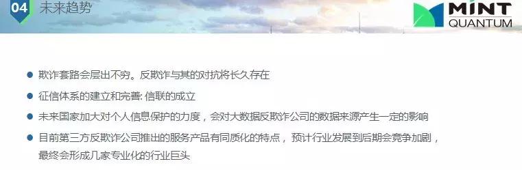對(duì)未來(lái)一點(diǎn)展望,欺詐永遠(yuǎn)不會(huì)停止、不會(huì)消失,尤其在中國(guó)征信沒(méi)有完全建立,人口多,社會(huì)缺乏金融知識(shí),對(duì)征信了解很少,收入差距比較大的環(huán)境下,欺詐現(xiàn)象會(huì)長(zhǎng)期存在,這在風(fēng)控里面是考慮的一個(gè)重要部分。征信體系的建立和完善,雖然這個(gè)過(guò)程會(huì)很長(zhǎng);目前第三方反欺詐公司推出的服務(wù)產(chǎn)品有同質(zhì)化的特點(diǎn),預(yù)計(jì)行業(yè)發(fā)展到后期會(huì)競(jìng)爭(zhēng)加劇,最終會(huì)形成幾家專(zhuān)業(yè)化的行業(yè)巨頭。